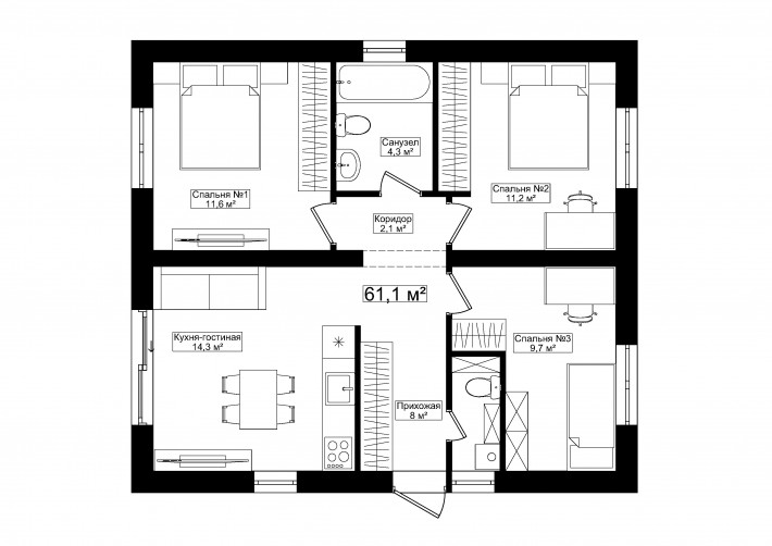 Компактный функциональный одноэтажный дом с оригинальным фасадом и двухскатной кровлей. Имеет 2 планировки две спальни или 3 спальни, кухню гостиную с выходом на террасу, котельную-постирочную, в которой можно разместить второй санузел.
