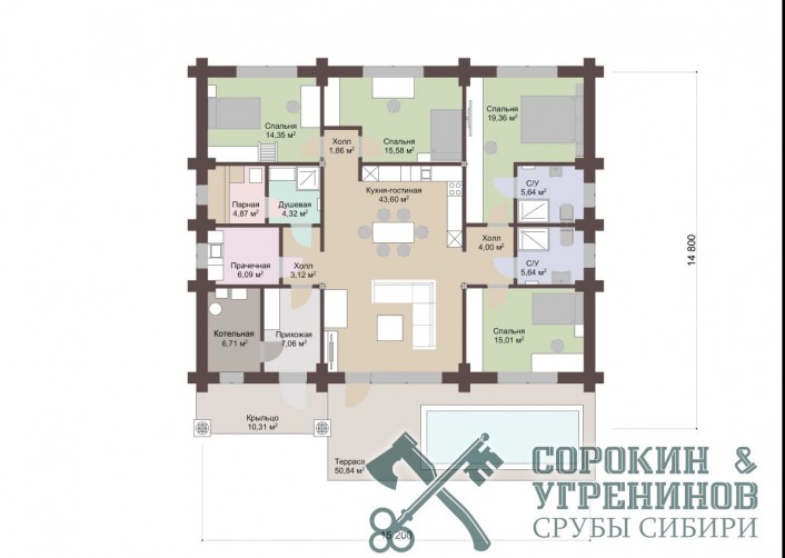 Дом рубленый из большого бревна кедра диаметром 450мм. Сруб общей площадью 229м2. Размер сруба 14х15,2 метров. Дом имеет четыре спальные комнаты, большая гостиная комната совмещена с кухней, небольшая парная и душевая комната, два санузла, прачечная, котельная. И еще есть крыльцо под навесом, и большая терраса с встроенным бассейном. Отличный красивый дом в классическом русском стиле, с высоким цоколем из кирпича и камня, отлично сочетается как эстетически визуально, так и практически, стуны из деревы максмально высоко от земли, а значит от влажности, что сделает дом более долговечным.