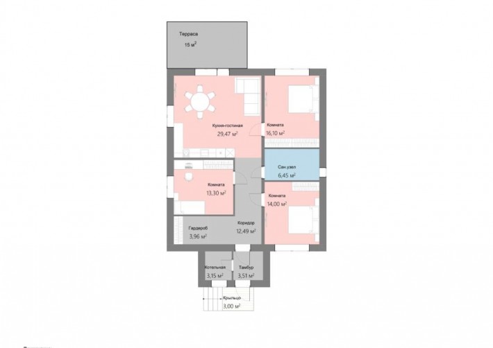 Эргономическая – помимо прихожей в помещении тамбура располагается тепловой пункт со всем инженерным оборудованием, а значит внутри дома можно организовать просторную гардеробную комнату или дополнительный с/у, а при желании и то и другое, превратив смежную комнату в мастер – спальню.